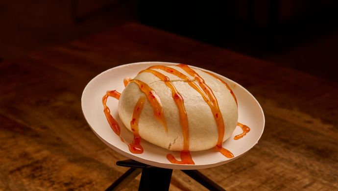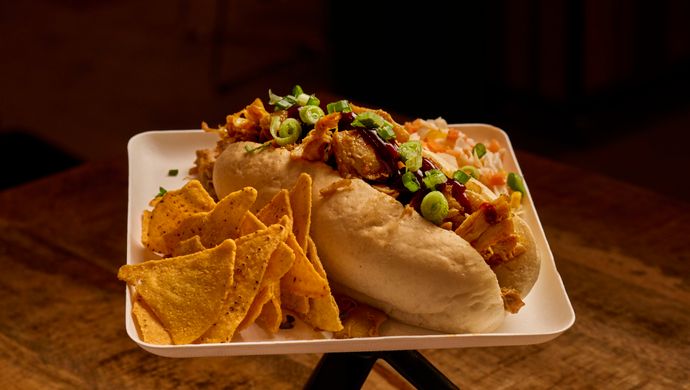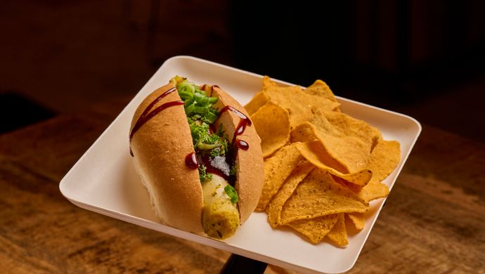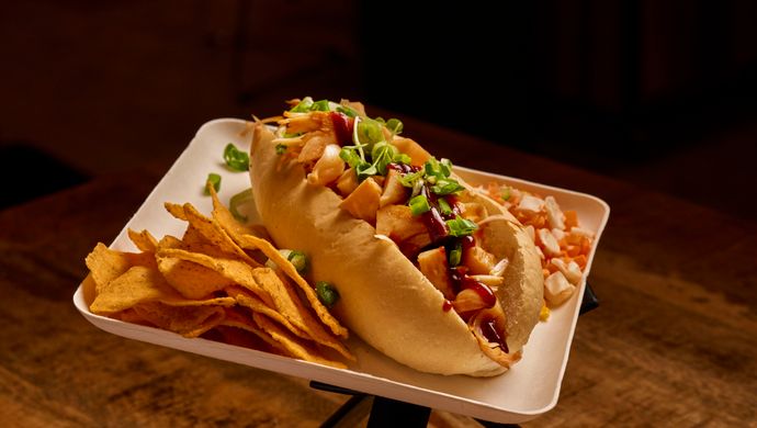 White roll with BBQ chicken sausage, tortilla chips, and BBQ sauce