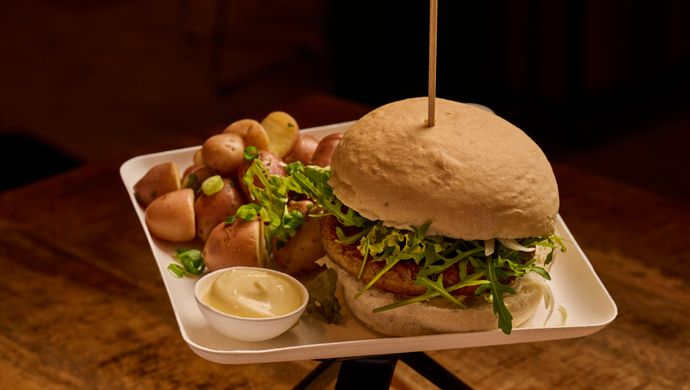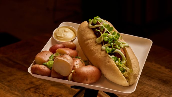 Ciabatta with Beyond sausage, avocado salsa, iceberg lettuce, and served with Roseval potatoes (Vegan)