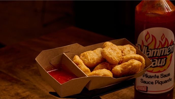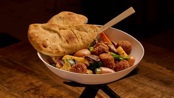 Vegan meatballs with vegetables, Roseval potatoes, madrass sauce, and naan bread
