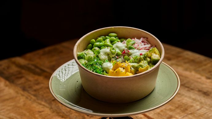 Poke bowl with mango, soybeans, seaweed, cucumber, radish, and avocado (Vegan)