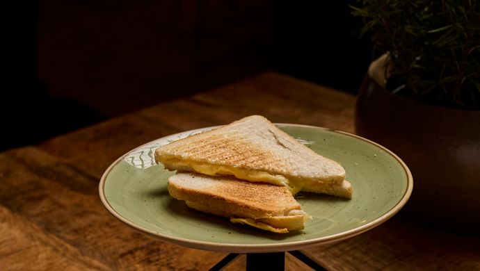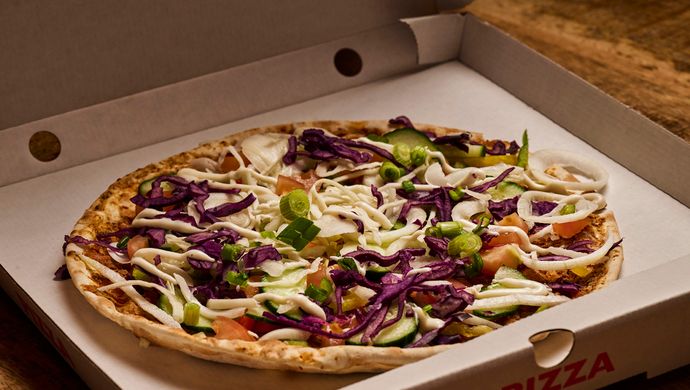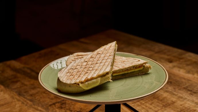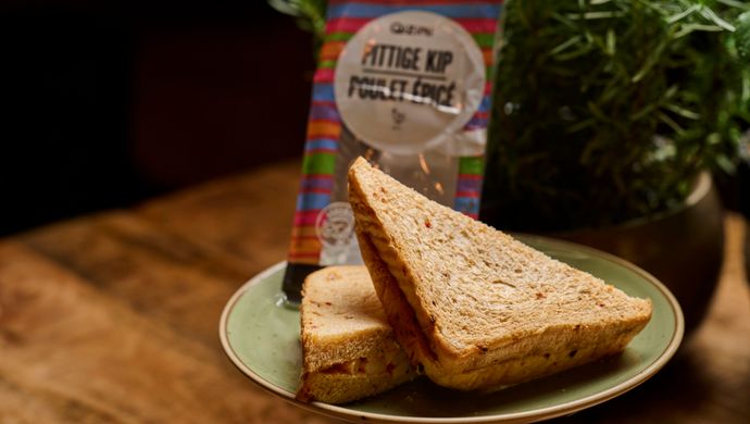 Ciabatta with pulled jackfruit, raw vegetable salad, BBQ sauce, and tortilla chips (Vegan)