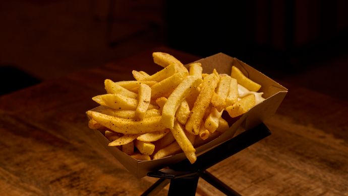 Ciabatta roll with beef burger, avocado salsa, iceberg lettuce, and served with Roseval potatoes