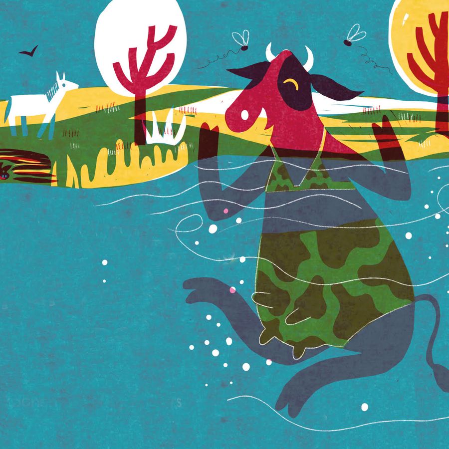 Koe verveelt zich. Ze is het geloei moe en wil wel eens wat anders eten dan gras. Koe duikt in de rivier om iets nieuws te ontdekken. Maar als koe ver van huis is, is het water wel erg koud en diep. Ze mist haar warme bed van stro. Komt koe weer veilig thuis?