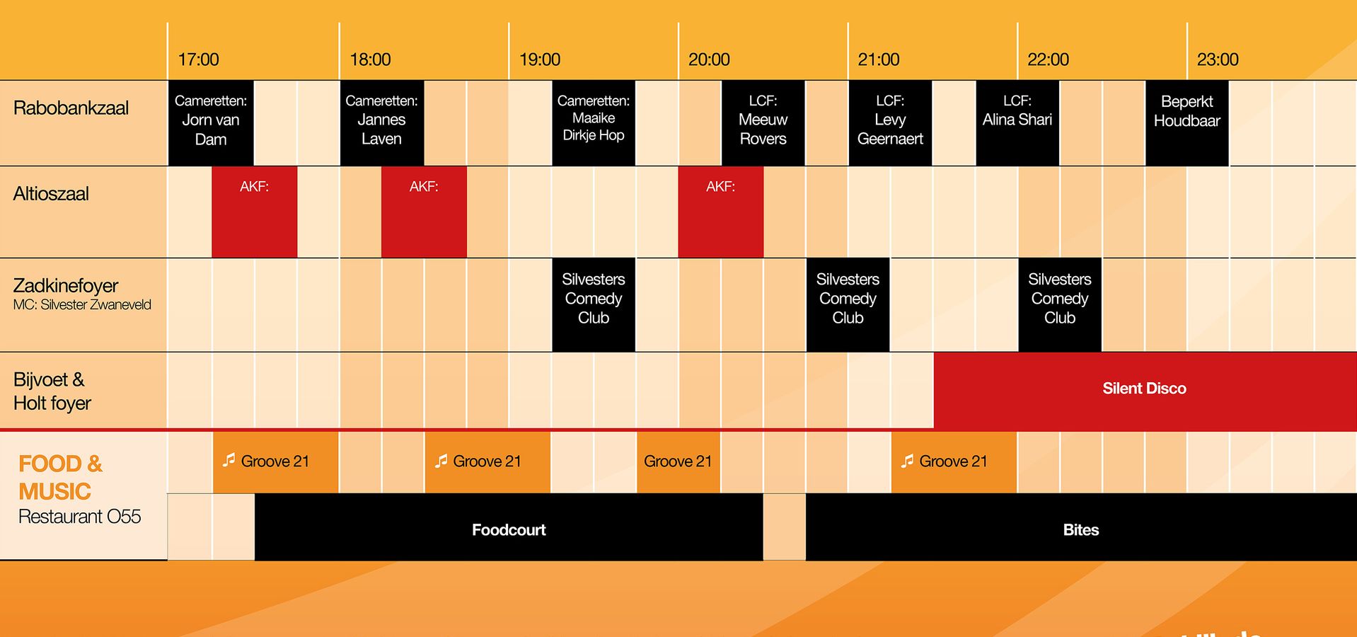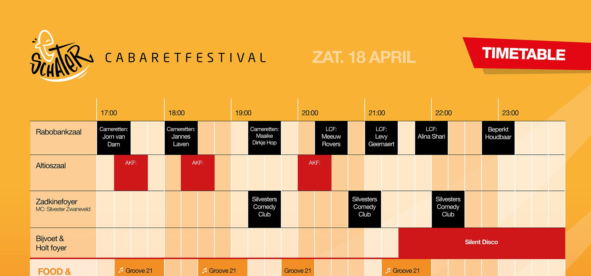 Op SCHATER wemelt het van het cabaret-talent, met de finalisten van Cameretten Festival, Leids Cabaret Festival en het Amsterdams Kleinkunst Festival. Ook is er (speciaal)bier, lekker eten en swingende muziek. We toveren onze foyer om tot heuse comedy club en een hilarische silent disco is te vinden in de Bijvoet & Holt foyer. SCHATER wordt afgesloten met Andries Turnu & Stefan Hendrikx met Beperkt houdbaar.