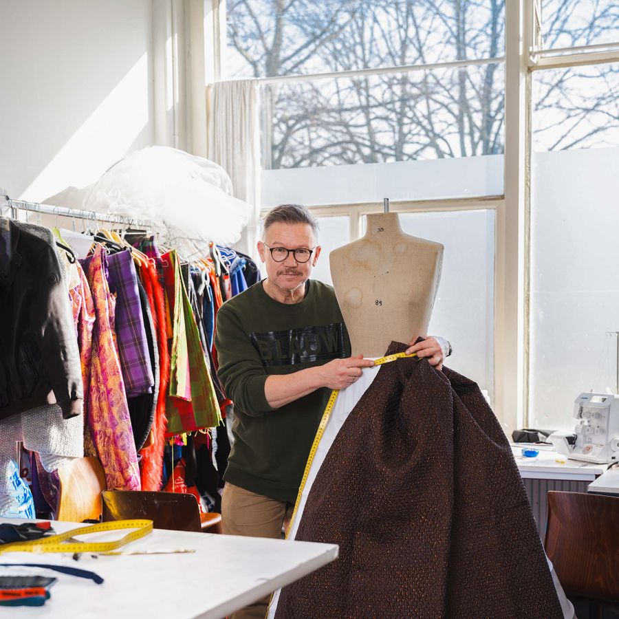 De bezoeker van zijn atelier krabt zich bij binnenkomst even achter de oren. Geen plek in deze kleine ruimte zonder lappen en rollen stof; willekeurig op stapeltjes of ergens tegenaan gezet. Voor het met plastic gedeeltelijk ondoorzichtig gemaakte raam een tafeltje met een kleine naaimachine, middenin een hoge tafel waarop hij zijn ontwerpen tekent en patronen maakt. En ter versiering her en der opgehangen posters van theaterproducties die hij aankleedde. Plien en Bianca, Hairspray uit 2009, Nijntje, De 3 Biggetjes. Een bescheiden selectie uit tientallen grote en kleine producties waaraan hij de afgelopen decennia werkte. Tegen de muren dozen van verhuisbedrijven met daarin spullen waarvan hij ook niet precies meer weet wat het is. Door de jaren heen verzameld op de Amsterdamse Noordermarkt en de Lapjesmarkt van Utrecht. Nog steeds neust hij daar rond zodra hij een nieuwe opdracht heeft en heeft nagedacht wat passend is en wat hij wil maken. Dan komt hij thuis met tassen vol stoffen, linten en biesjes, geeft ze soms in zijn badkuip nog het gewenste kleurtje en kleedt er een voorstelling mee aan.