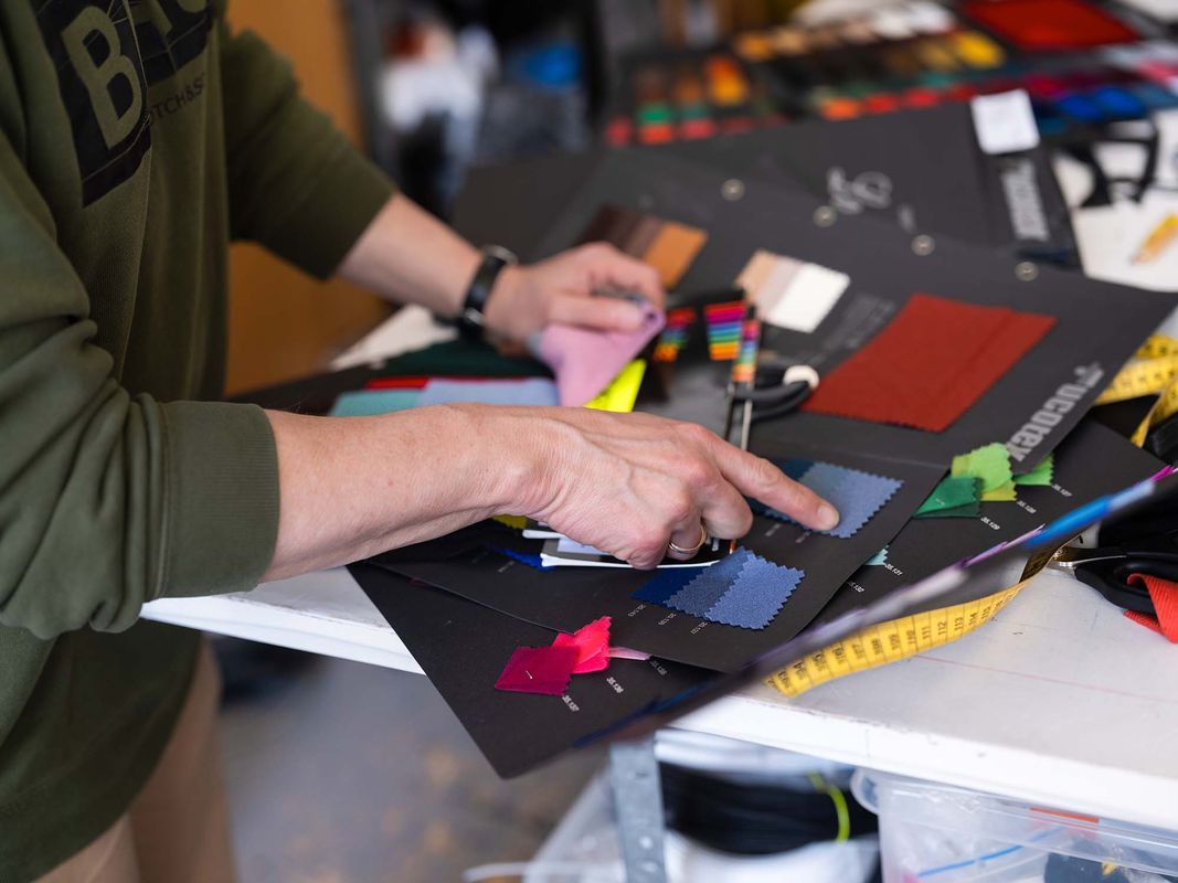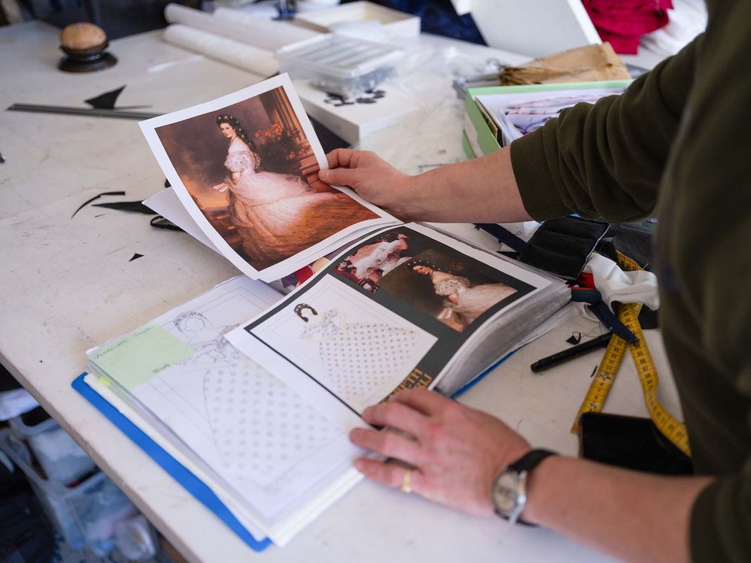 “Je zit vaak vast aan de tijd waarin een stuk zich afspeelt en aan het oorspronkelijke concept, zoals bij deze musical. Dan kun je wat minder je eigen stempel op de kostuums drukken. Keizer Franz-Joseph droeg bij officiële gelegenheden altijd een blauw jasje met rode broek. Wist je dat Walt Disney zijn sprookjesprinsen ook in die kleuren afbeeldde? Dat baseerde hij op deze keizer. Zo staat hij op talrijke schilderijen. Ik kijk de kleding en de kleuren van historische figuren daar ook vaak van af.” Soms lukt het hem niet de juiste stof met de juiste kleur te vinden. Hij haalt een aantal staalkaarten uit een kast en toont een stukje stof. “Lichtblauw, maar niet te helder. Dat wilde ik hebben voor het jasje van onder meer Franz-Joseph.”