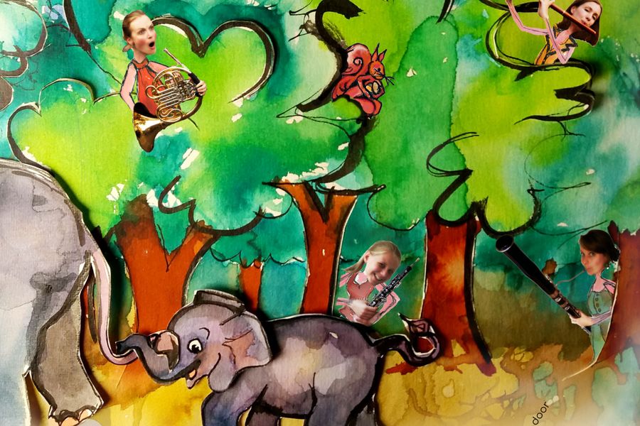 Muziek van o.a.: Dubois, Gebauer, Bartok en Muczynski en de kinderliedjes ‘olifantje in het bos’, ‘in de maneschijn’ en ‘1,2,3,4, hoedje van’.