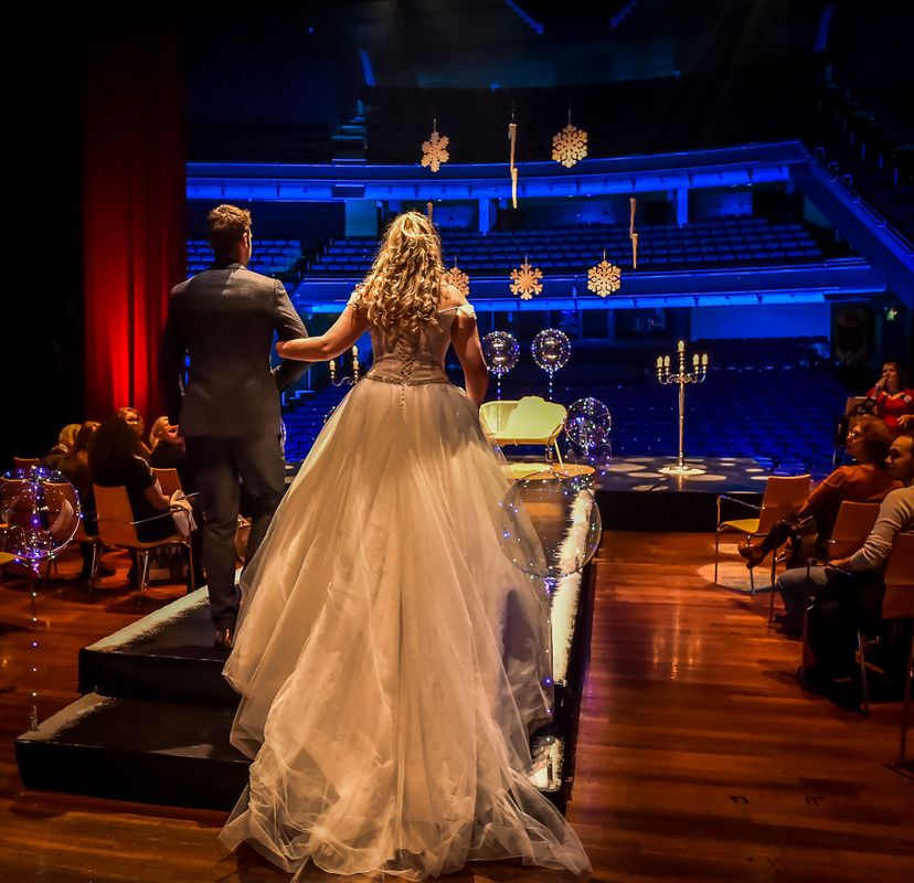 Jullie betreden het geheel in jullie stijl ingerichte podium, de spotlights gaan aan en de Buitengewoon ambtenaar van de Burgerlijk stand neemt het woord. Jullie gasten zitten 1e rang, maar alle aandacht gaat uit naar jullie, het aanstaande bruidspaar.
