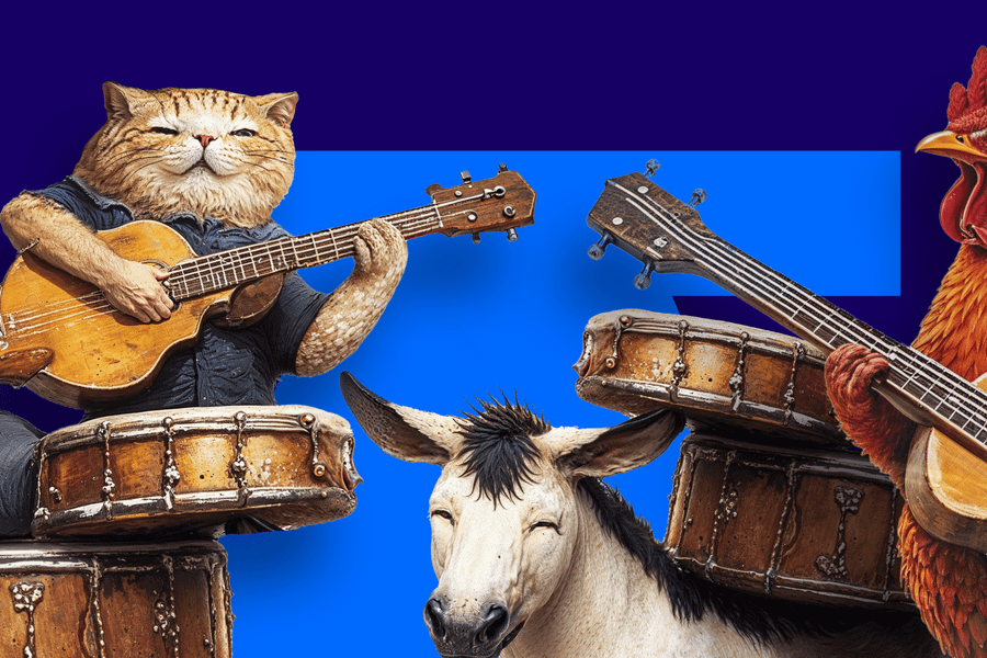 Een afgedankte ezel die accordeon speelt, een zingende henhaan met een viool, een jonge wolfshond die saxofoon speelt en een bange kat die trommelt. Vier dieren vormen gezamenlijk een bont gezelschap. In de ogen van de mensen zijn de dieren te oud of niet meer geschikt om hun werk te doen. Vol energie storten ze zich in een muzikaal avontuur.