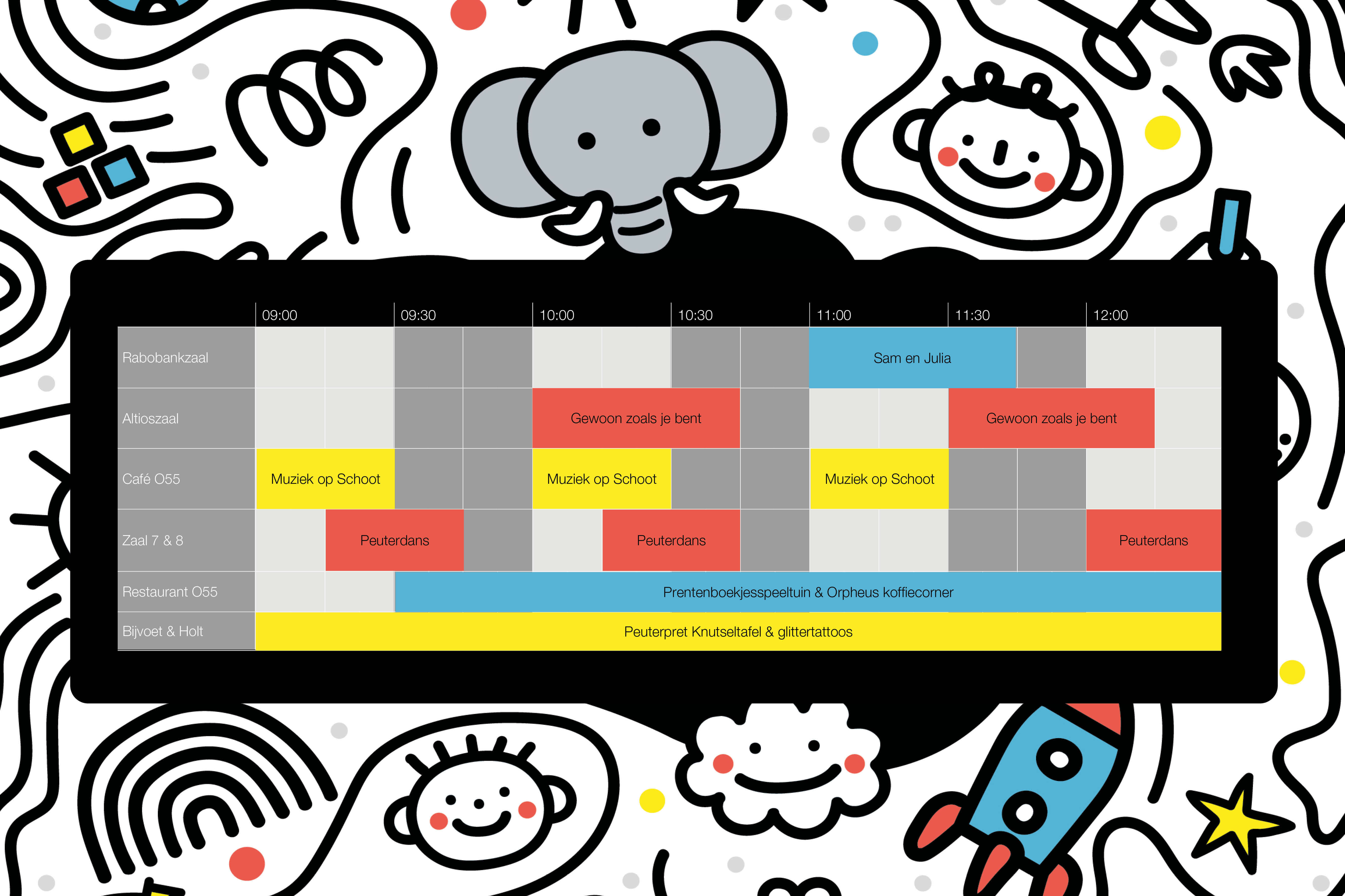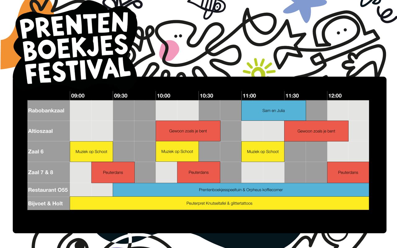 Tijdens het Peuterpretfestival is er van alles te doen voor peuters én ouders. Geniet van de voorstellingen Gewoon zoals je bent en Sam & Julia. Papa's en mama's genieten van een heerlijke latte macchiato in de koffiecorner terwijl de kinderen zich vermaken in de Peuterpretspeeltuin of aan de knutseltafel. Nog energie over? Boek er dan een actieve Peuterpretworkshop bij, en ga samen met je peuter muziek maken of dansen!