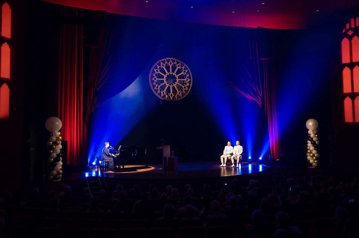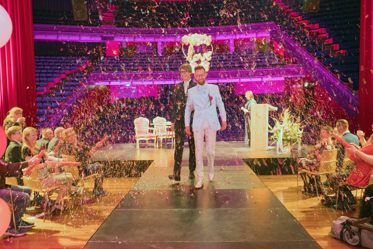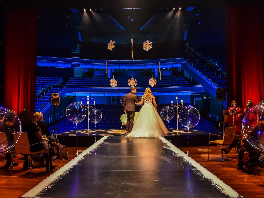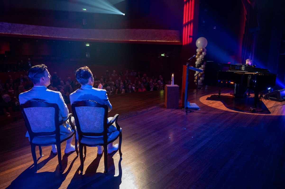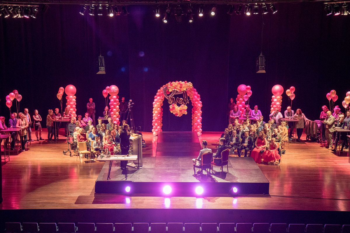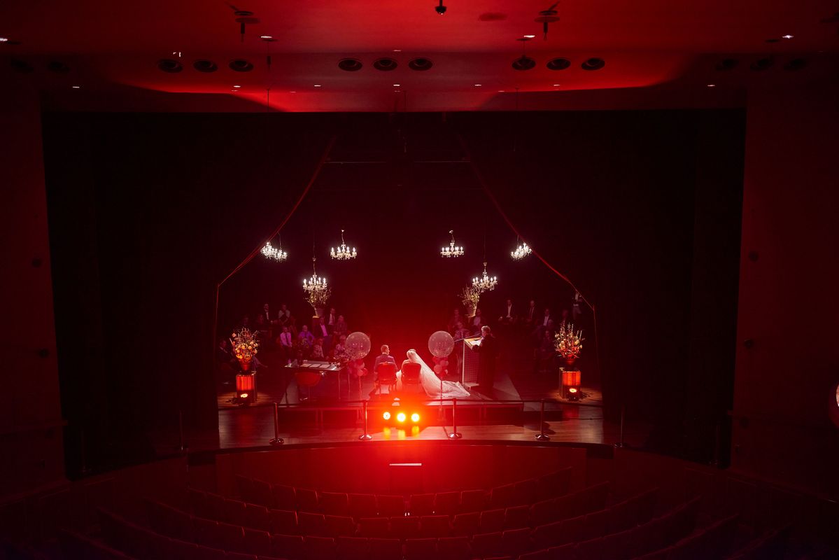 Jullie betreden het geheel in jullie stijl ingerichte podium, de spotlights gaan aan en de Buitengewoon ambtenaar van de Burgerlijk stand neemt het woord. Jullie gasten zitten 1e rang, maar alle aandacht gaat uit naar jullie, het aanstaande bruidspaar.