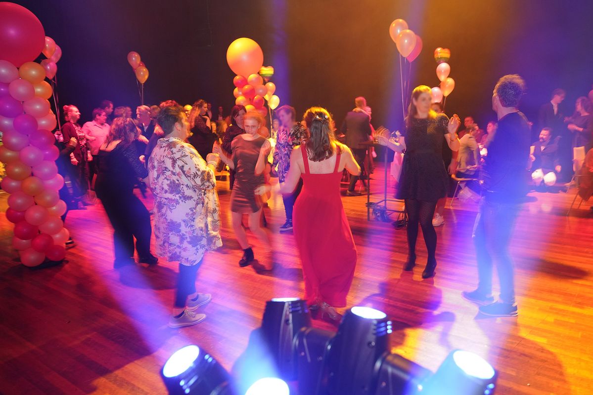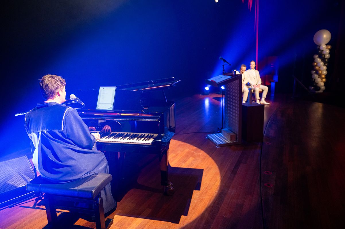 Scene 3: op het toneel, taart, bubbels en felicitaties