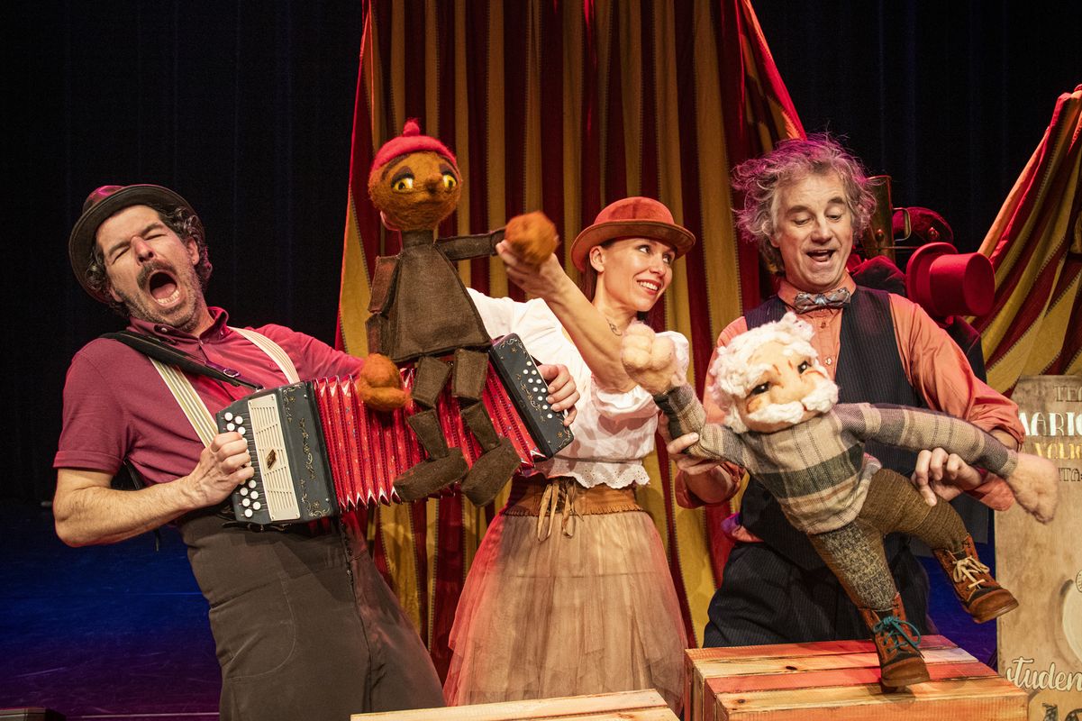 Met deze woorden begint een theatergezelschap vol enthousiasme met de opvoering van het beroemde verhaal Pinokkio. Het gezelschap haalt letterlijk alles uit de kast om de avonturen van de houten pop te verbeelden. Muziek, clownerie en natuurlijk poppenspel, het wordt een bont spektakel. Of een vrolijk feest der mislukking? Komt dat zien, komt dat zien!